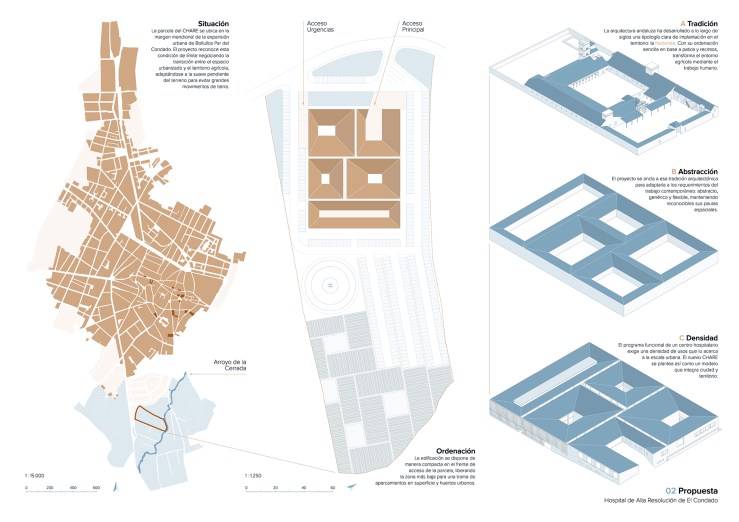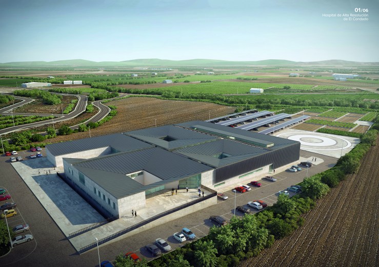 La estrategia seguida para la implantación del Hospital de Alta Resolución de El Condado en el entorno histórico-paisajístico de la región queda explicitada gráficamente en los planos de la propuesta. Se entiende que la ocupación humana en un entorno agrícola como el nuestro cuenta en Huelva, y en el marco general de Andalucía, con una tradición de siglos que no se puede soslayar. Por ello el punto de partida es la tipología de implantación en el territorio andaluz por antonomasia, la hacienda. La manera concreta en que esta estructura humana se impone en el terreno y a la vez participa de él, mediante una envolvente clara y una serie de patios de distinta cualidad (de labor, del señorío) a los que se asocian edificaciones dedicadas a usos muy diversos (almazara, establo, lagar, etc.) está refrendada por su amplia difusión en nuestra cultura. Con mayor motivo resulta apropiada si vemos que las similitudes entre este tipo y el del claustro monacal, que es el que da lugar a las primeras tipologías hospitalarias, están fuera de toda duda.