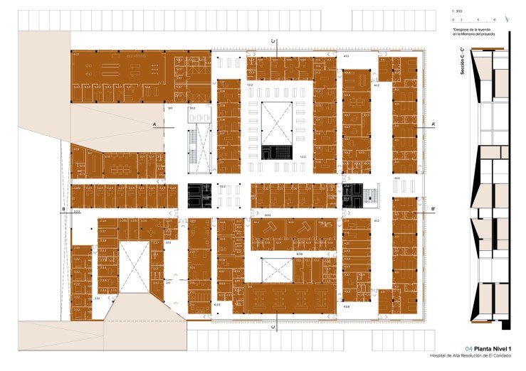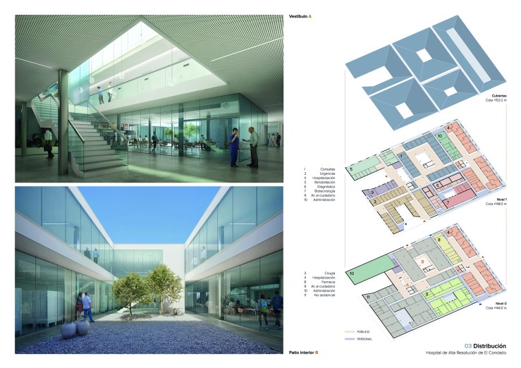 Partiendo de este esquema abstraído de particularidades, se procede a trabajar en el encastre de las distintas piezas del sistema hospitalario según su lógica interna, esto es, la necesidad de que unas determinadas zonas deban estar en contacto con otras (consultas con diagnósticos, cirugía con hospitalización) o con el exterior (atención al público, urgencias). El número y variedad de conexiones requeridas demuestran que un hospital puede compararse al nivel de densidad y complejidad de una pequeña ciudad, en la que las distintas plazas-patios sirven como punto de encuentro y de reconocimiento de la estructura general. La densidad de usos se hace patente en la reducción de las dimensiones de estos espacios, compensada con la conversión de los pasillos centrales en pozos de luz para las estancias adyacentes.
