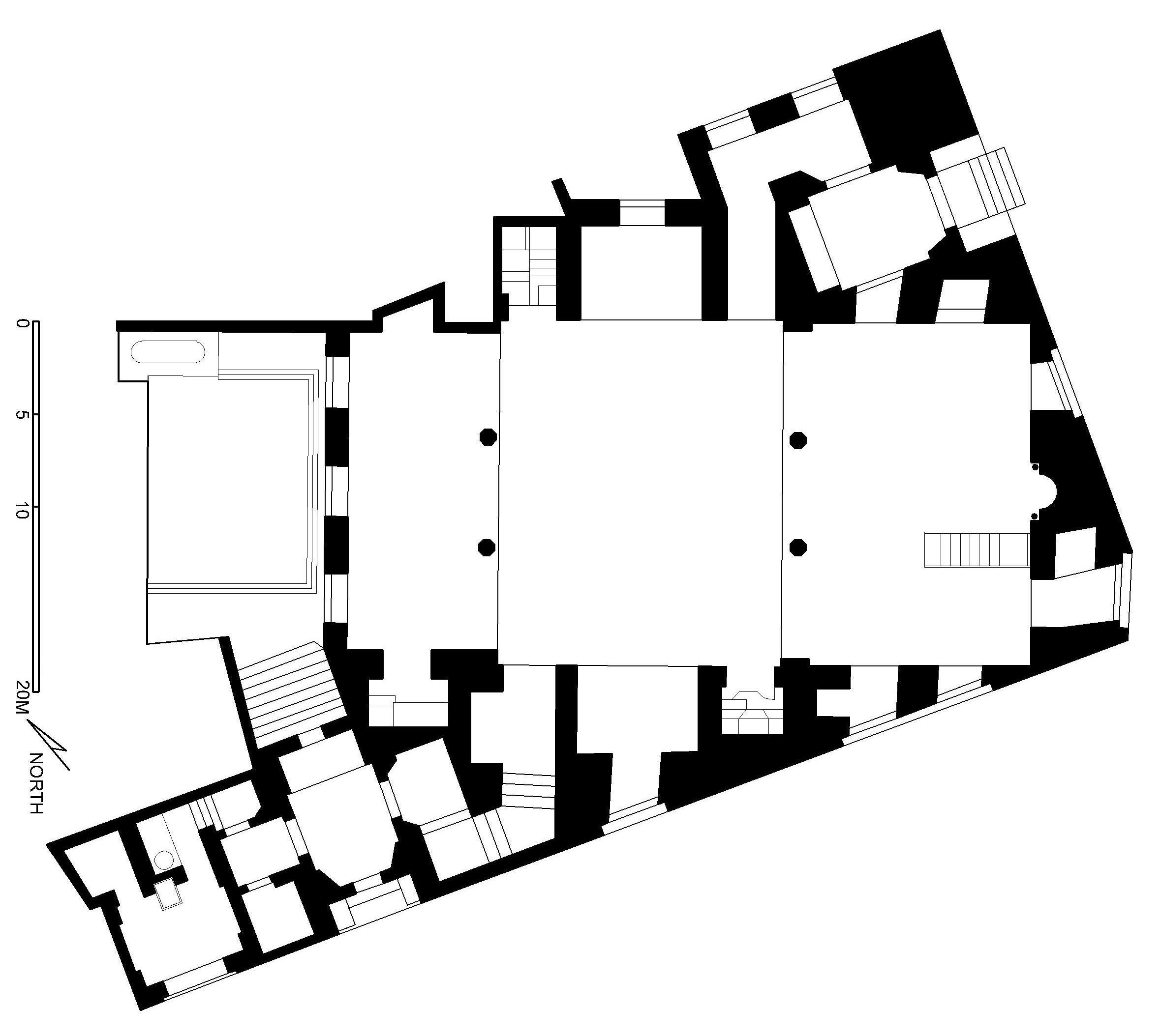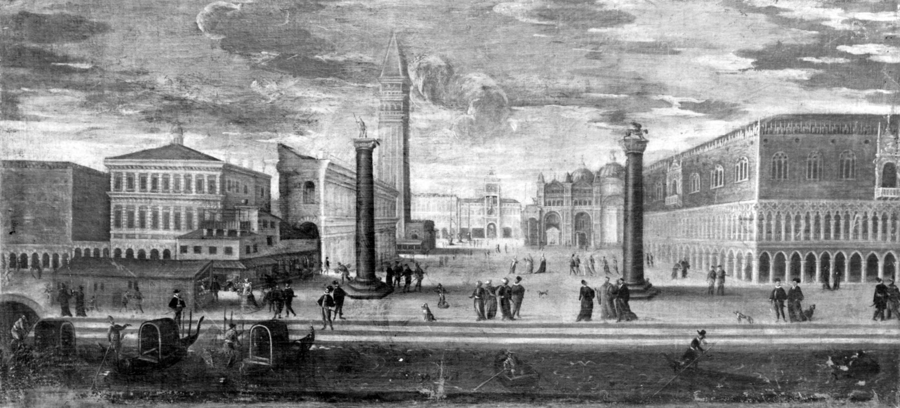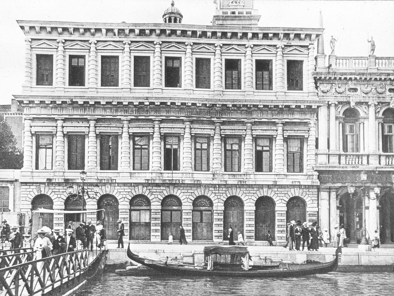 La causa principal de que estas dos construcciones se traben con tan buen acuerdo como Tyson y Holyfield es que nunca se pensaron para estar unidas. Así lo muestra un dibujo de la escuela de Lodovico Pozzoserrato, en el que se contemplan las últimas edificaciones medievales que aún marcaban la salida a la laguna de la archiconocida Piazza San Marco. Vincenzo Scamozzi, el arquitecto que tuvo la fortuna de heredar la clientela del mismo Sansovino y de Palladio, nada menos, concluyó ambos edificios prolongando las líneas de la Biblioteca independientemente de su concepción original de 7–3–7 módulos, que aún puede leerse en la planta.