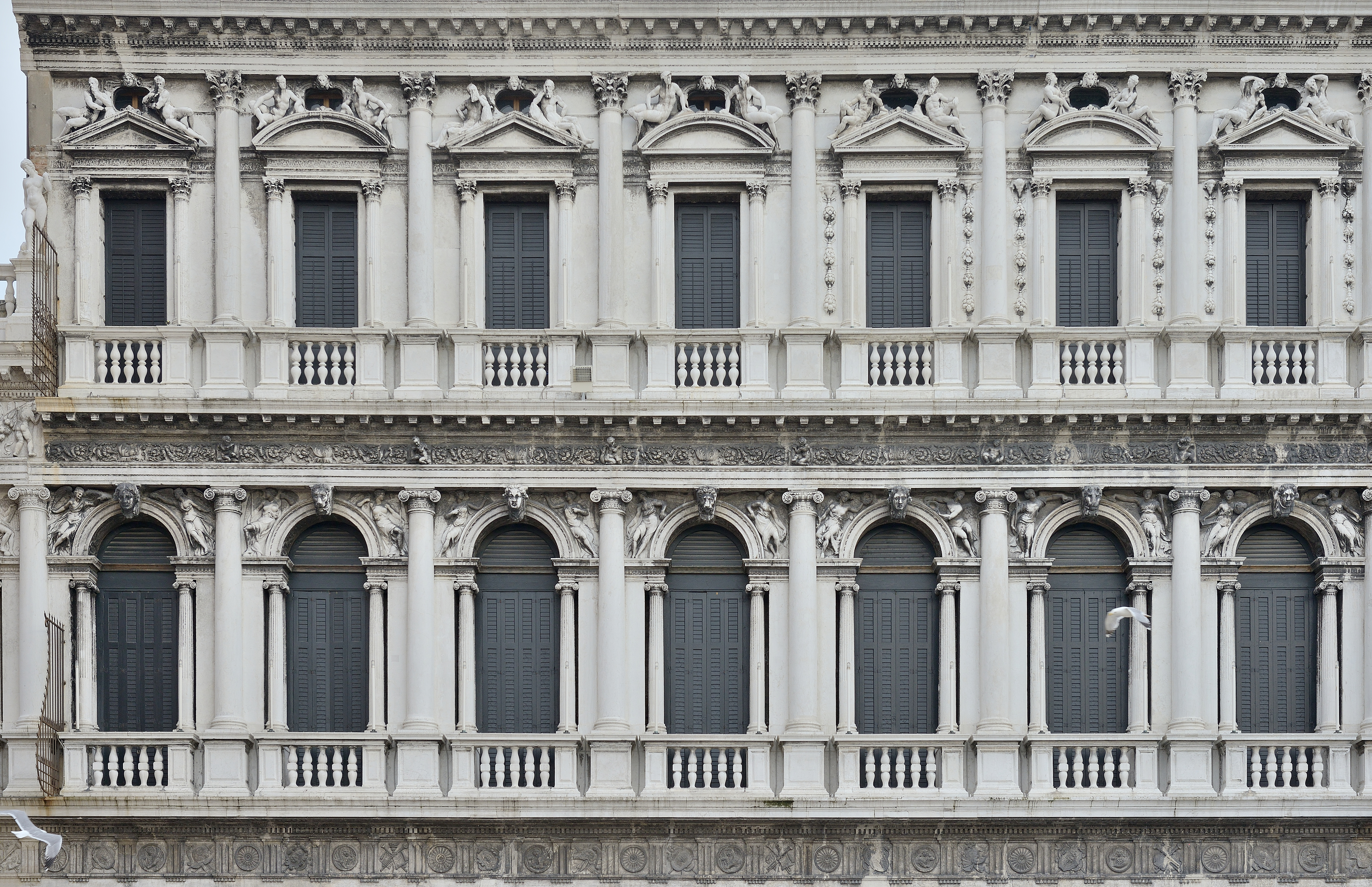 Aún más interesante resulta saber que Scamozzi también prolongó la Biblioteca hacia el lado contrario, esta vez para construir las Procuratie Nuove de la plaza. Aquí, en cambio, hizo gala de una gran sutileza al «corregir» a su maestro, reduciendo levemente el friso que aquel había dispuesto. La comparativa entre estas dos formas de coser una intervención urbana puede decirnos tanto sobre las variaciones en el sentir de una época como la lectura de la abundante tratadística que las acompañó.