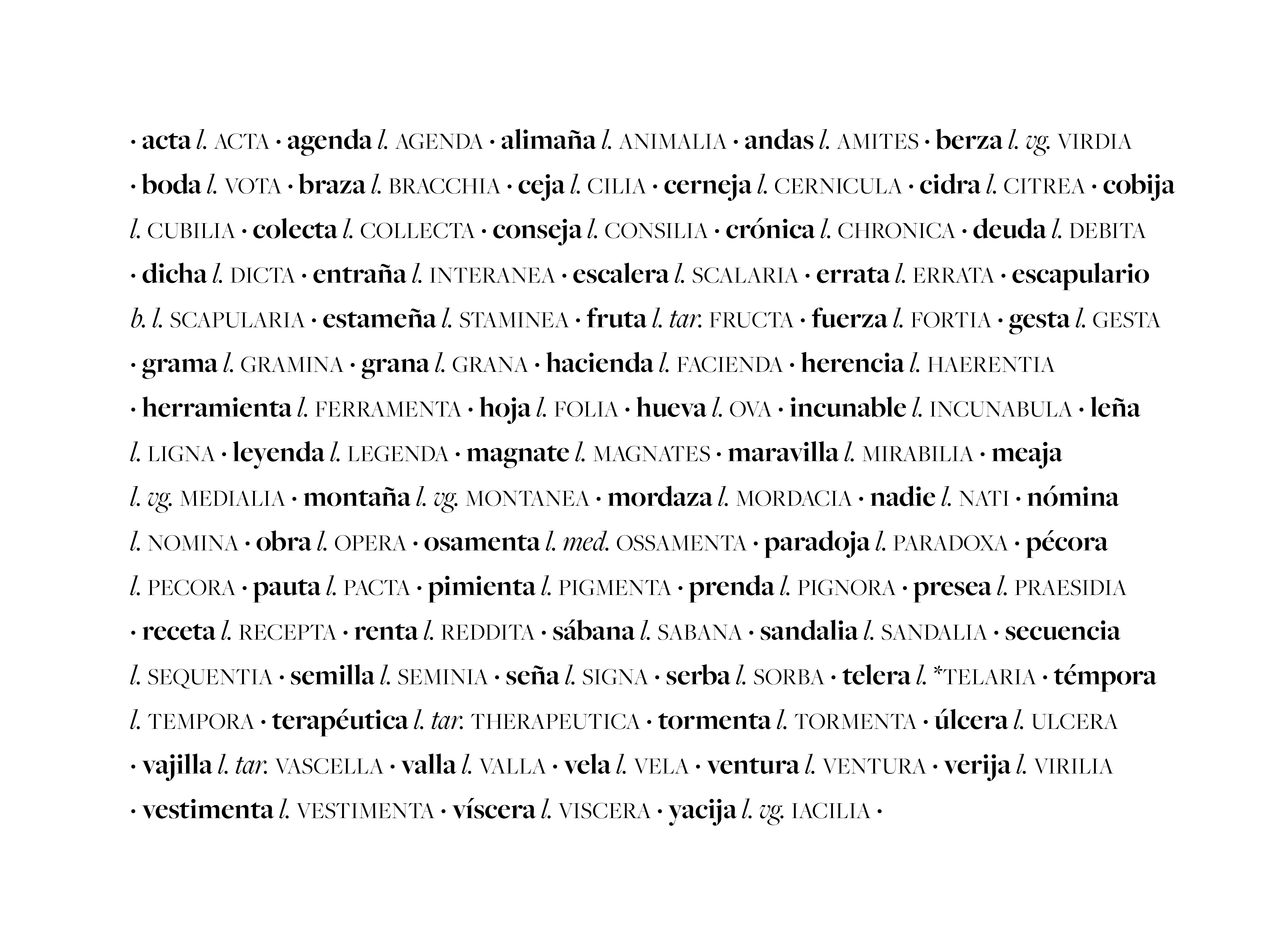 Esta es una lista, nada exhaustiva, de plurales fósiles en lengua castellana. Todas estas palabras fueron en algún momento entendidas como pertenecientes al número plural y, aunque la mayoría de ellas fueron regramaticalizadas como singulares, en otras persiste de algún modo su condición original, al entenderse como nombres colectivos o incontables. No hay más que preguntarse cuál es el plural de «leña» para entender de lo que se habla. Pero es que, más allá de este fenómeno concreto que sirve de ejemplo, se podría decir que el corpus de cada lengua no es sino un gigantesco fósil: repetimos los fonemas, palabras y construcciones que heredamos de generación en generación, los cuales fueron escogidos por algún motivo que en su uso corriente está completamente olvidado, aunque no por eso deja de determinarnos.