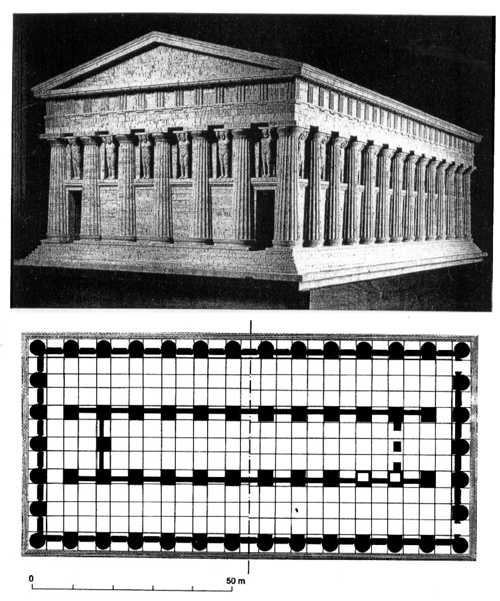 Los habitantes de Agrigento en Sicilia, seguramente conocedores de la historia ateniense aunque completamente ajenos a su moraleja, intentaban unos cuarenta años más tarde construir su propio santuario a Zeus, esta vez de 6.300 m2. Pero los sicilianos irán un paso más allá: no se construye un monumento a la tiranía utilizando el lenguaje esbelto y refinado de un peristilo, no hay reglas de proporción que mantener cuando se habla de un frente de 113 m de largo. Saben que una escala sobrecogedora requiere una composición sobrecogedora: las cuatro fachadas se materializan como muros totalmente opacos, donde se van alternando semicolumnas incrustadas de 4 m de diámetro en la base con figuras de atlantes, que sujetan la inmensa mole del entablamento y la cubierta. El lado corto es heptástilo, negando la posibilidad de una entrada central; se abren entonces dos huecos laterales, casi pidiendo disculpas, pues el Templo tiene vocación de ser macizo, inexpugnable, inescrutable. Por supuesto, y esto es probable que los propios agrigentinos supieran mientras lo estaban construyendo, el Templo nunca se acabaría, y de él queda poco más que la gran huella de una gigantesca explanada y dos de los telamones. El miércoles 25 de abril de 1787, Goethe visita sus ruinas como parte de su Viaje a Italia. Encuentra el espectáculo grotesco, anotando «nos marchamos con la ingrata sensación de que no había nada que hacer allí para los dibujantes».