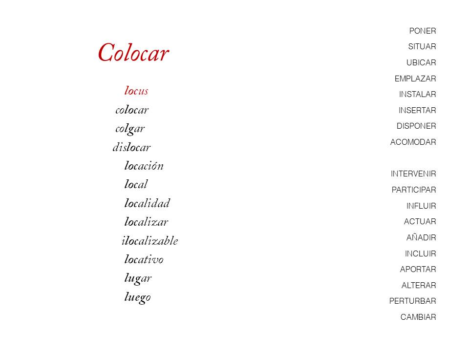 La palabra colocar viene en última instancia del latín locus, un término que ha sido empleado en estudios sobre lo urbano para significar lo que el lugar tiene de propio y distintivo. Colocarse es, por tanto, insertarse en una realidad previa que cuenta con sus propias reglas. De entre las acciones en la ciudad, es además una de las que nos es más connatural: colocar la mercancía, colocarse uno mismo, viendo y dándose a ver, entrando en un juego de relaciones con el espacio público que nos rodea. Una acción tanto más propia de climas cálidos como el nuestro, en que se convierte incluso en una necesidad. Es como si sintiéramos la compulsión de ocupar el espacio que nos es más cercano, de colocarnos en él y llevarlo a una escala más menuda, como si una suerte de horror vacui recorriera nuestras ciudades y nos obligara a llenarlas de bártulos, efigies, altarcillos y tenderetes.