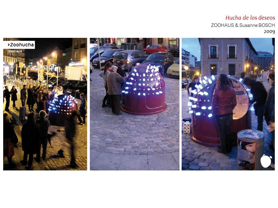Siguiendo unas pautas similares, en 2009 el colectivo Zoohaus junto con la artista alemana Susanne Bosch colocaron en pleno corazón de La Latina, en Madrid, lo que ellos llamaron “hucha de los deseos”. La idea, probada ya en otros países de Europa, es que los vecinos depositen en ella las monedas de curso legal anterior al euro que todavía posean, a la vez que escriben un pequeño deseo que también introducen, a cuya satisfacción supuestamente se destina lo recaudado. A juicio de los autores, la “hucha de los deseos” funciona como un índice de la implicación ciudadana porque según la cantidad de monedas que se inserten, la iluminación es más o menos intensa. Además, frente a un mobiliario urbano convencional, que es resolutivo y aclarador, la hucha sería un “mobiliario controversia”, al generar interacción social, participación pero también conflicto.