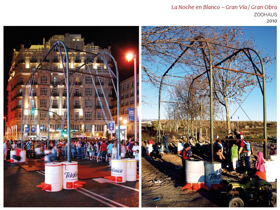 Algo parecido experimentan también cuando en 2010, como parte de La Noche en Blanco en Madrid, convierten una simple cuba en una caja de resonancia de las voces ciudadanas: entrando en el juego uno puede oír lo que otra persona tiene que decir, sin prejuicios, sin saber quién es. A veces lo más interesante de entender una actuación urbana como un colocar, es que el objeto colocado es susceptible de ser puesto a prueba: como no se le supone carácter de permanencia, puede darse por fallido o demostrar su valía en sus segundas vidas, siendo reclamado en otros espacios donde aún pueda ser de utilidad.