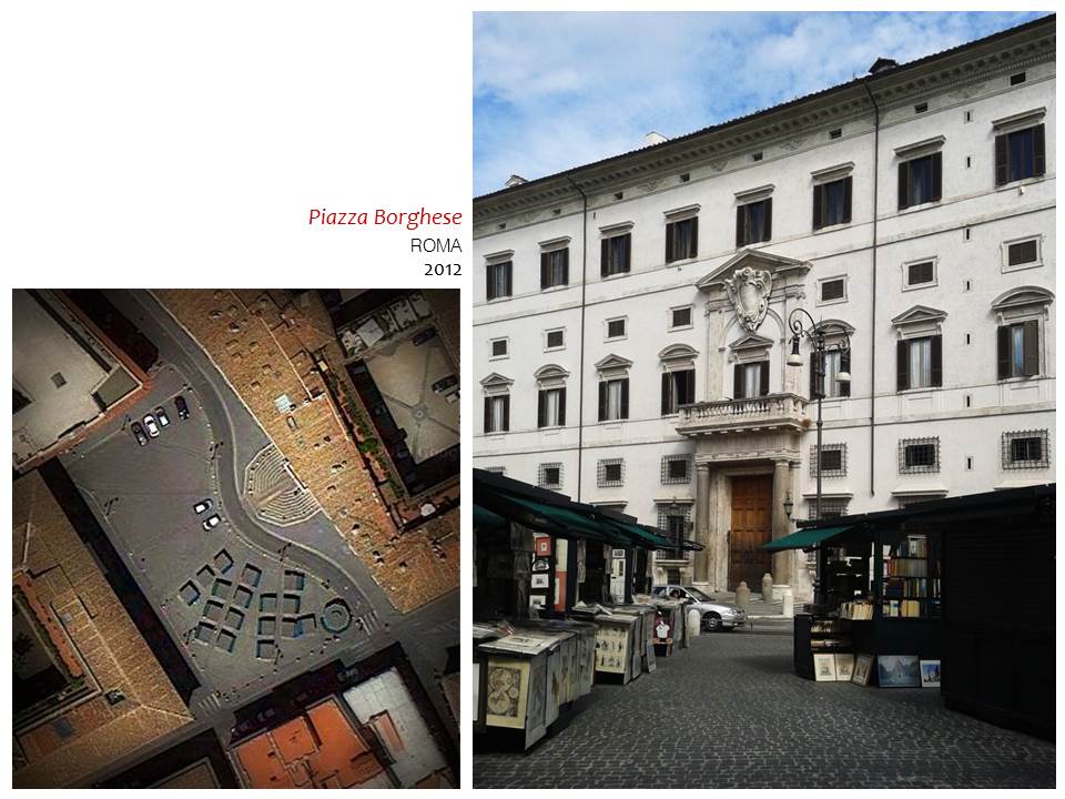 Colocarse en el espacio público, tras pasar ese primer estadio de espontaneidad, se convierte pronto en una acción muy intencionada: por ejemplo, resulta que en Piazza Borghese, en Roma, la disposición de todos los tenderetes es tal que la fachada del famoso palacio que da nombre a la plaza permanezca siempre como fondo de todas las miradas; y que el espacio que abraza la iglesia de San Lorenzo, en Florencia, queda claramente subdividido por la disposición del mercado callejero en uno de mucha menor escala, que absorbe todo el tránsito y bullicio, dejando otro mucho más diáfano en el que la iglesia puede adquirir, imperturbada, todo el protagonismo.