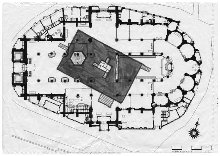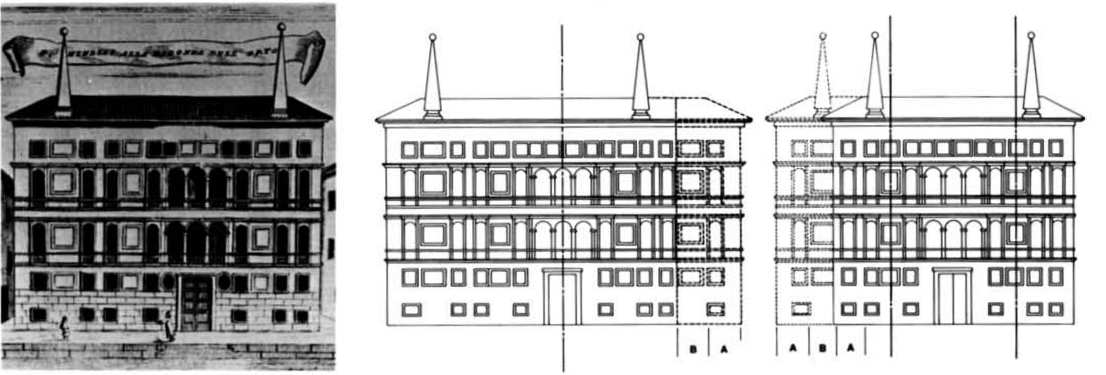 La causa principal de que estas dos construcciones se traben con tan buen acuerdo como Tyson y Holyfield es que nunca se pensaron para estar unidas. Así lo muestra un dibujo de la escuela de Lodovico Pozzoserrato, en el que se contemplan las últimas edificaciones medievales que aún marcaban la salida a la laguna de la archiconocida Piazza San Marco. Vincenzo Scamozzi, el arquitecto que tuvo la fortuna de heredar la clientela del mismo Sansovino y de Palladio, nada menos, concluyó ambos edificios prolongando las líneas de la Biblioteca independientemente de su concepción original de 7–3–7 módulos, que aún puede leerse en la planta.